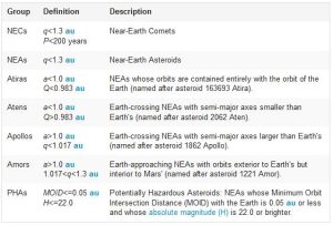 According to the United Nations Office for Outer Space Affairs, Near-Earth Objects, or NEOs, represent potentially catastrophic threats to our planet. A near-Earth object is an asteroid or comet which passes close to the Earth’s orbit. In technical terms, a NEO is considered to have a trajectory which brings it within 1.3 astronomical units of the Sun and hence within 0.3 astronomical units, or approximately 45 million kilometers, of the Earth’s orbit. NEOs generally result from objects that have experienced gravitational perturbations from nearby planets, moving them into orbits that allow them to come close to the Earth.